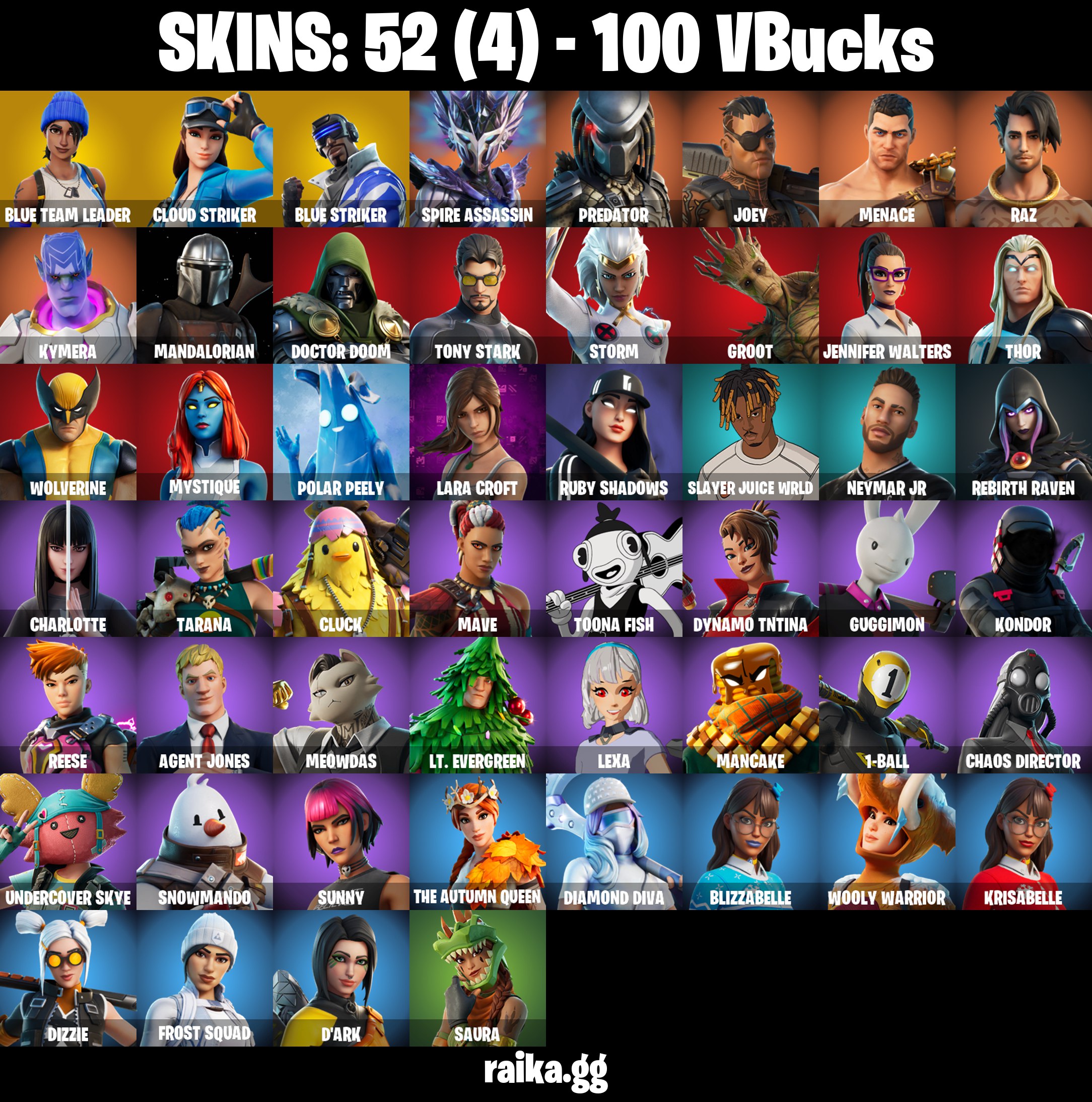 Fortnite Account includes 52 skins Blue Team Leader Cloud Striker Blue Striker and more, Rust Bucket Backpack, Pry Axe Pickaxe, Rage Emote, Astroworld Cyclone Glider, and 100 V Bucks